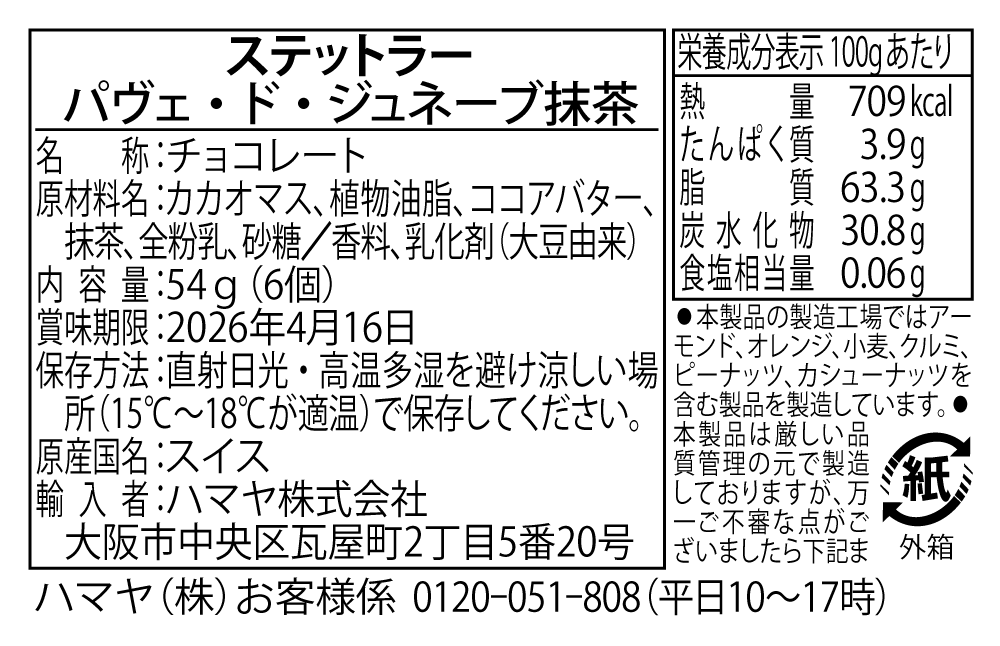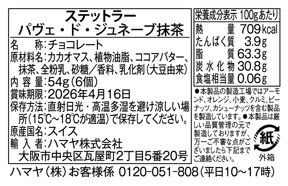 ステットラーの代表的なチョコレート「パヴェ・ド・ジュネーブ」の優しい口どけはそのままに、抹茶のほろ苦さと濃厚な風味が調和したチョコレートです。